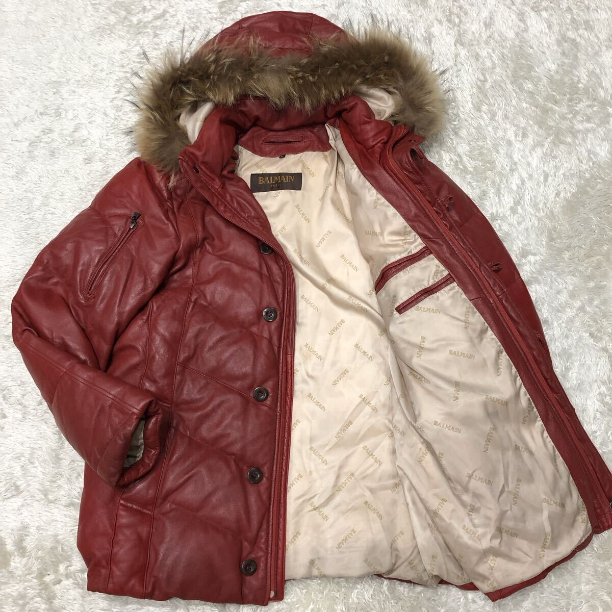 > 超希少XL!バルマン【極暖の極み】BALMAIN レザー ダウンジャケット レッド 2way 羊革 ラムレザー リアルファー ダウン フェザー 秋冬 LL 2L