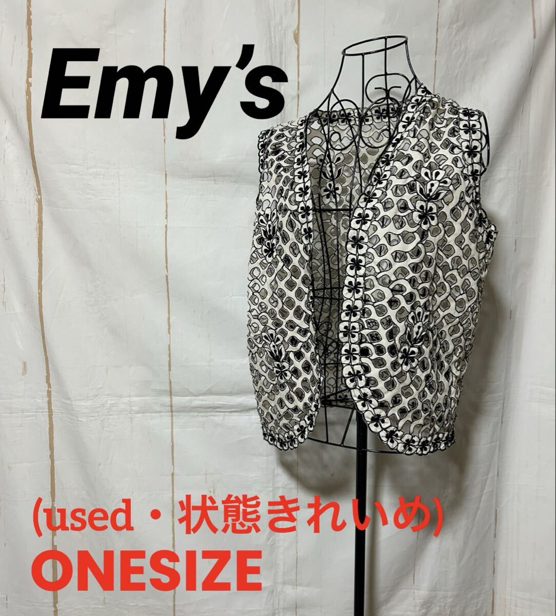 - Emy’s 総レース ベスト ノースリーブジャケット 羽織り(used、状態普通使用感〜ややきれいめ)ワンサイズ、アイボリー×ブラック