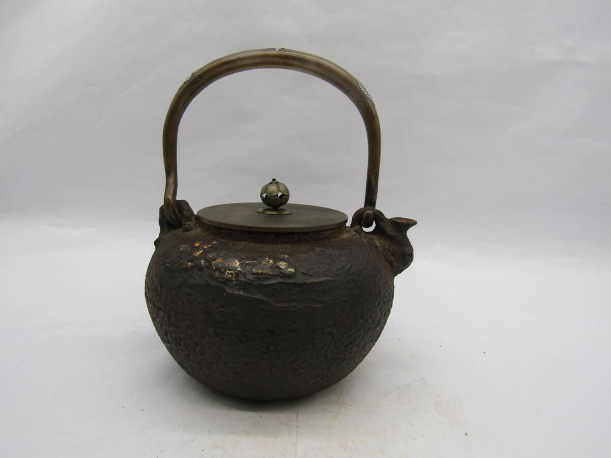 - 鉄瓶 時代 金銀象嵌 楼閣山水 日本亀文 在銘 煎茶道具