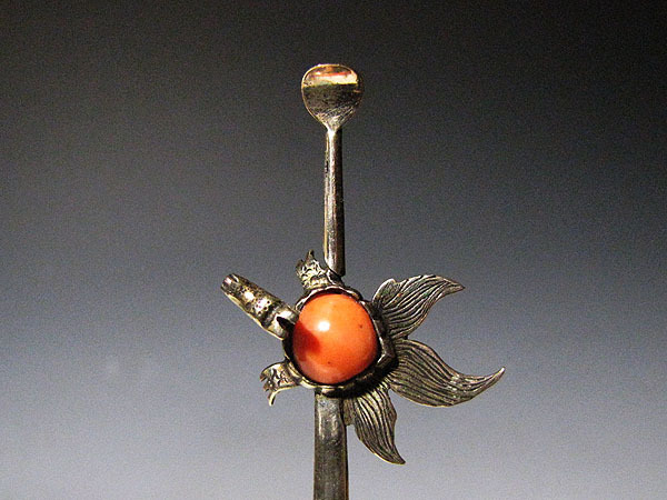 - 【桃】アンティーク髪飾り:金工本珊瑚蓑亀簪