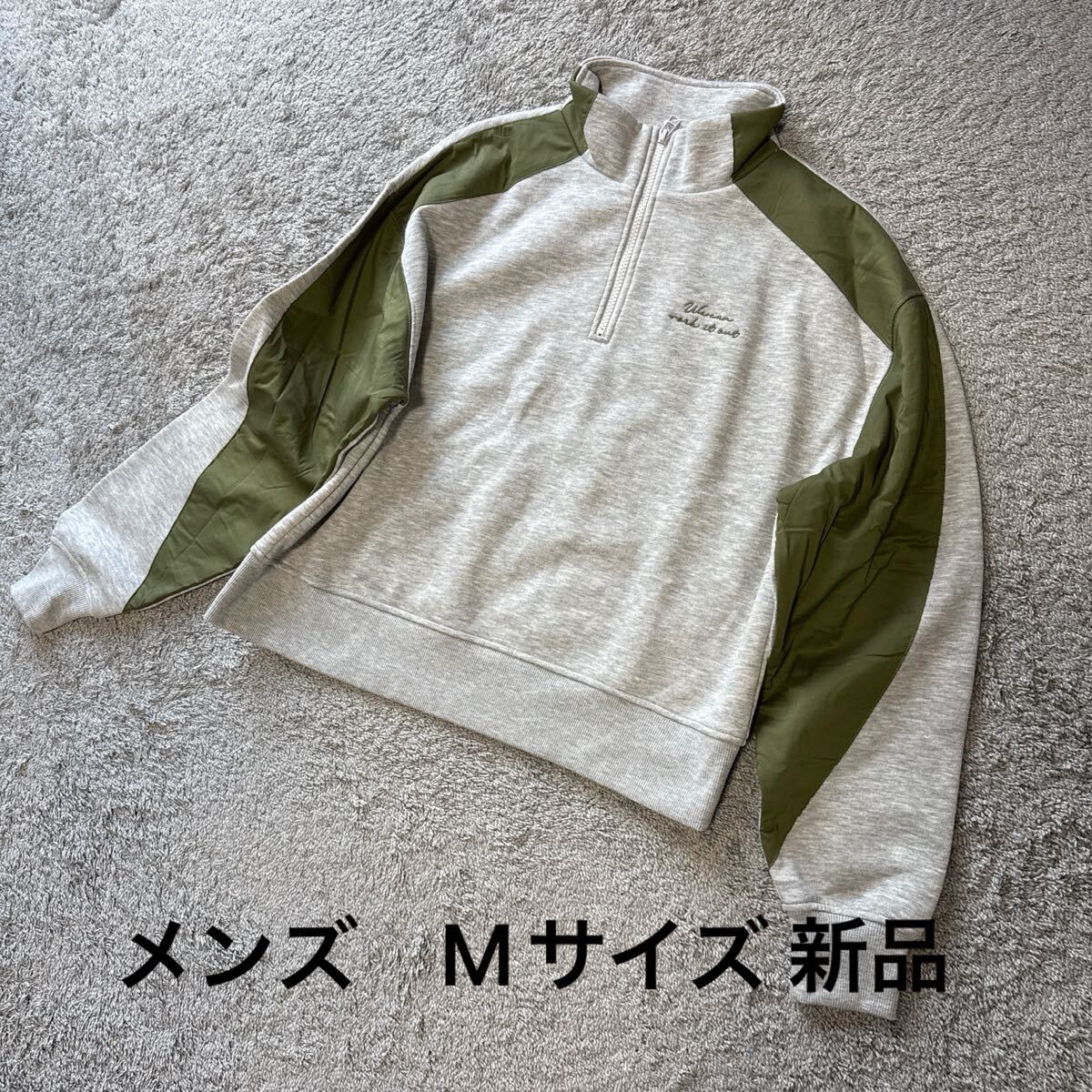 - メンズ 裏起毛ロゴ刺繍異素材配色ネックジップトレーナーグレーカーキM★ゆうパケット配送可能★新品27