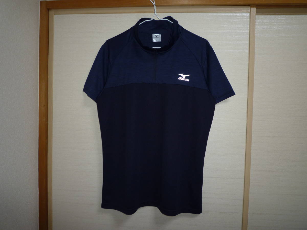 - ミズノ ハ−フジップ半袖シャツ 紺×黒 Lサイズ