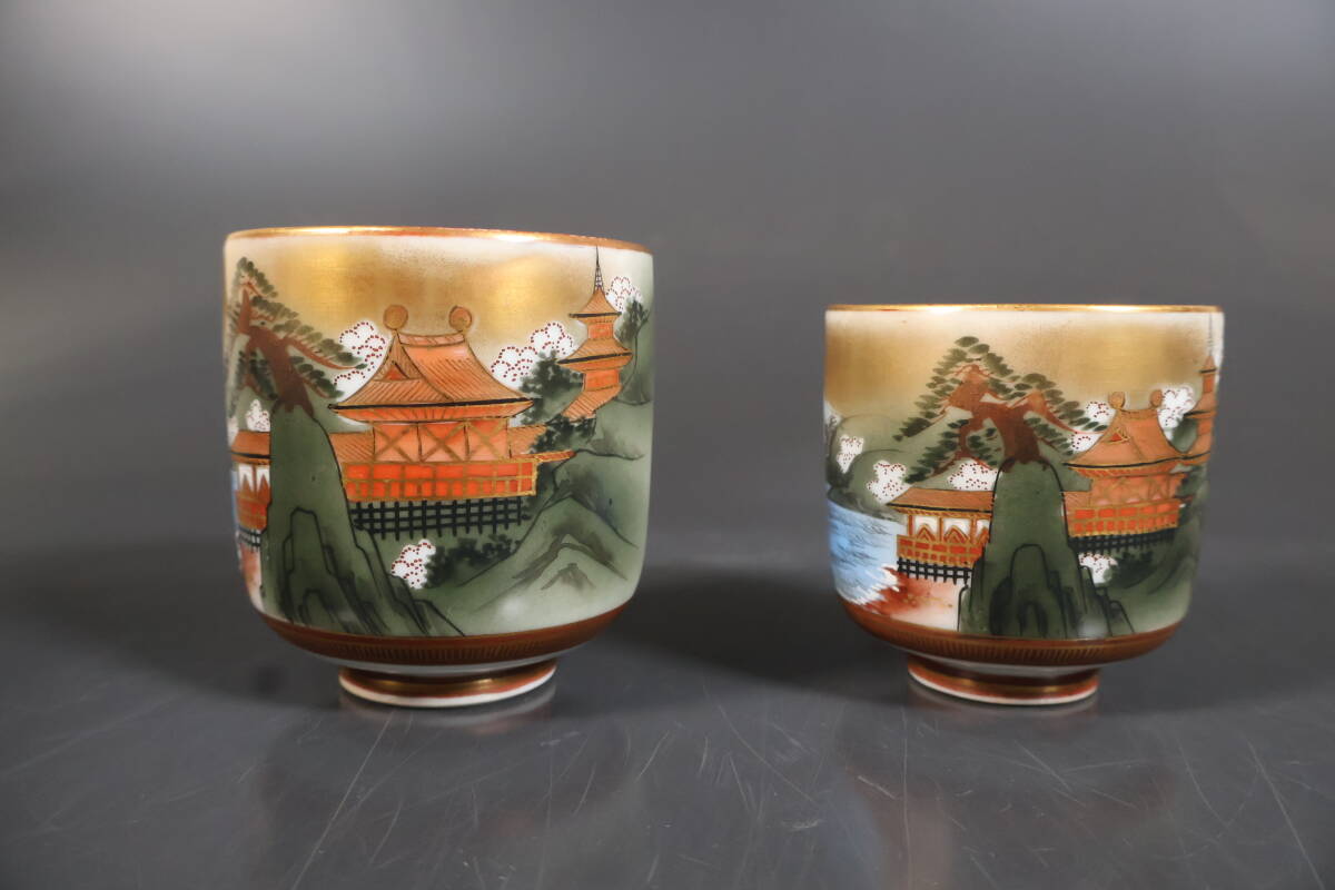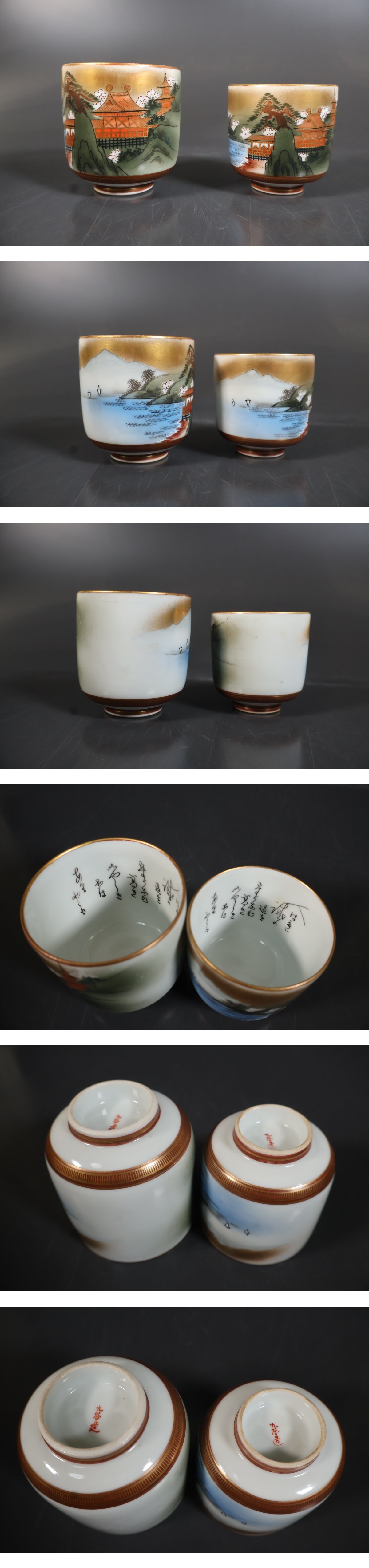 - 【和】(A3555) 時代古作 九谷焼 色絵細字湯呑 大小 夫婦湯呑