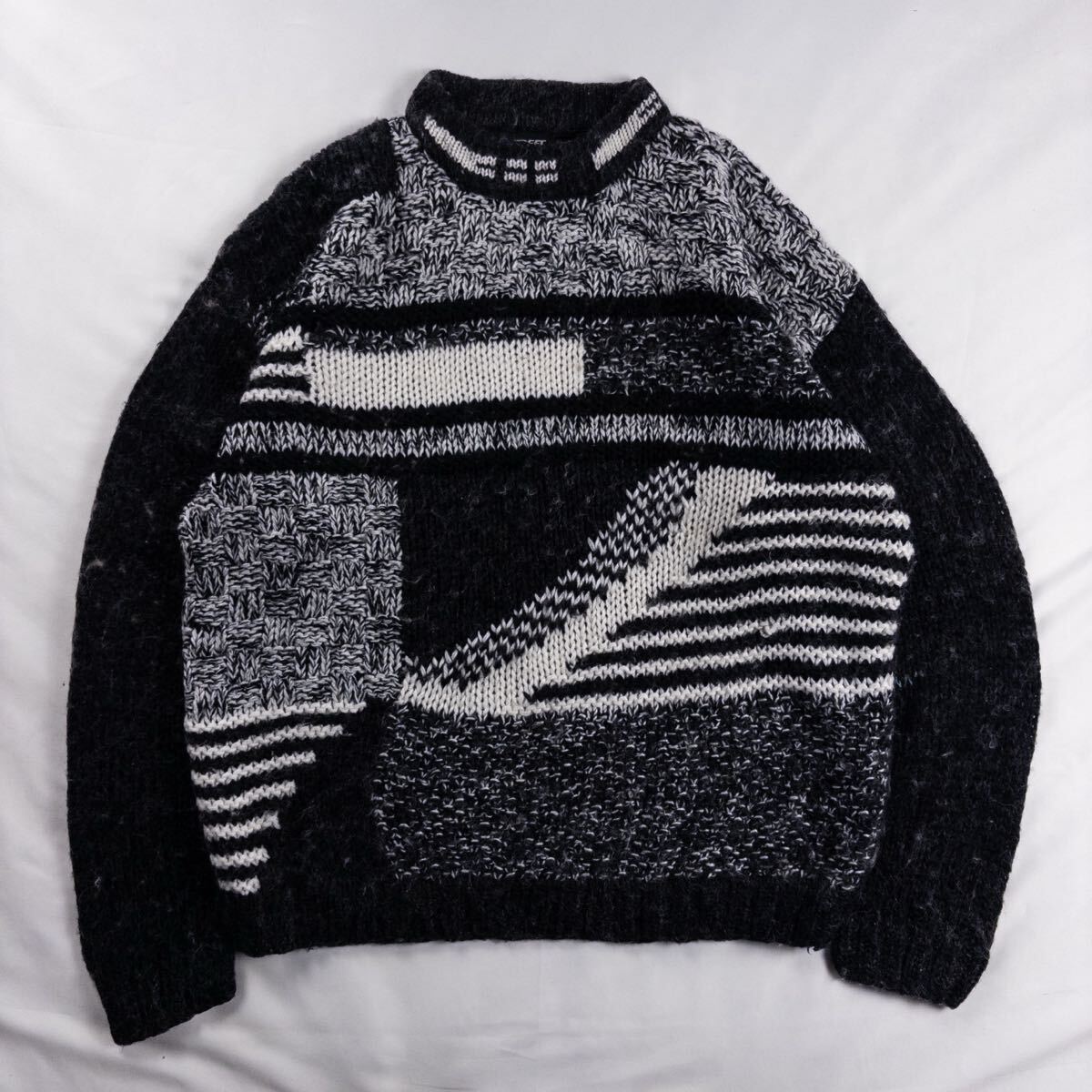 > US Vintage 90s STREET SCENES アクリル ウール ローゲージ モノトーン アート クレイジーパターン 立体 幾何学模様 メランジ 総柄ニット