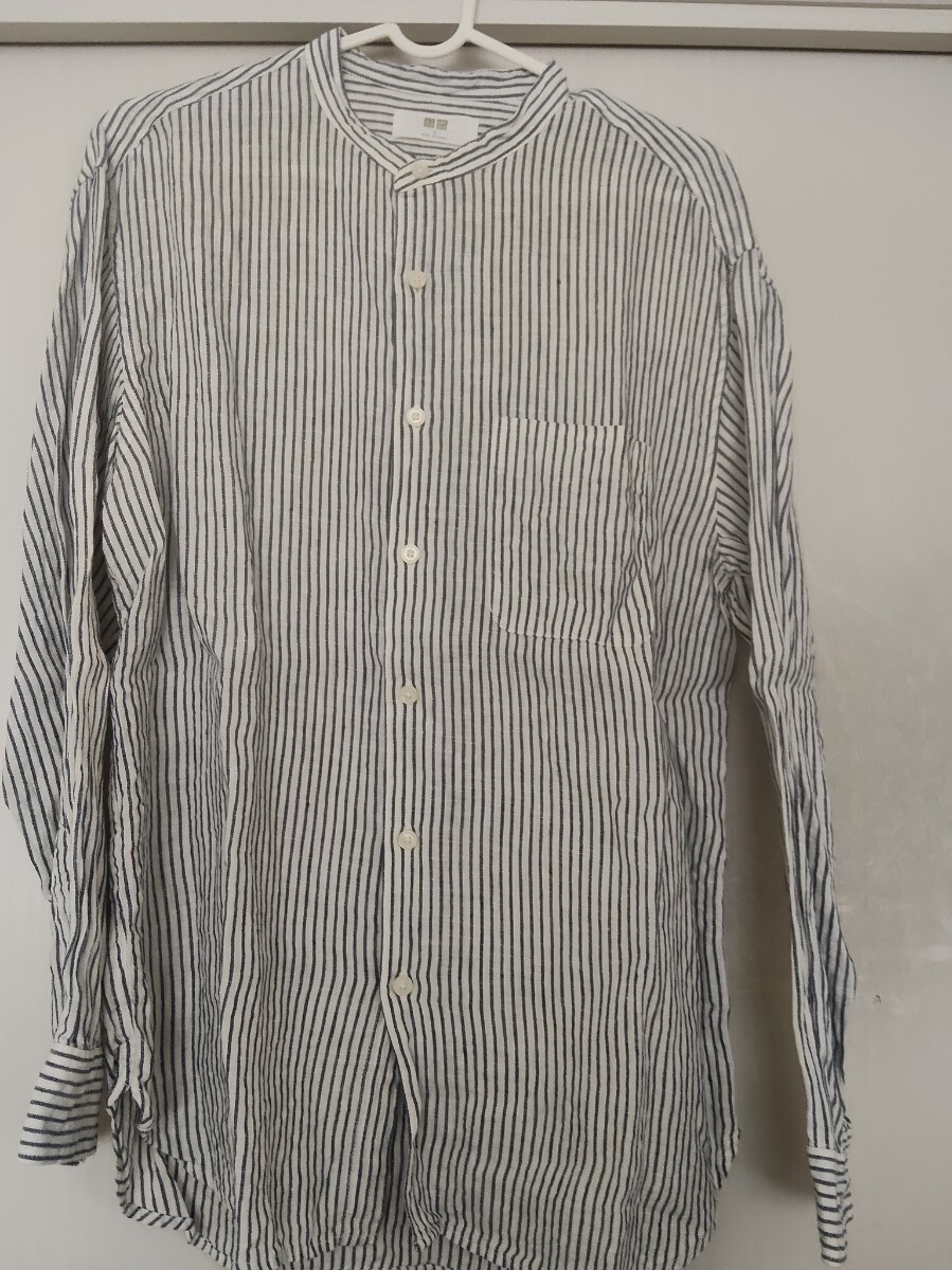 > ユニクロ プレミアムリネン スタンドカラー ストライプシャツ 長袖 ブルー 綿100% サイズS ¥2,990購入