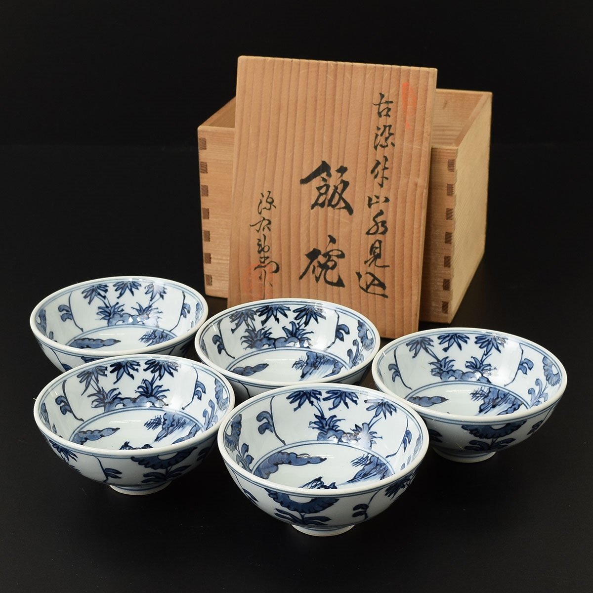 - ◎540703 未使用品 有田焼 源右衛門 古染休山水見込 飯碗揃 五客 高約5.5cm 径約12cm