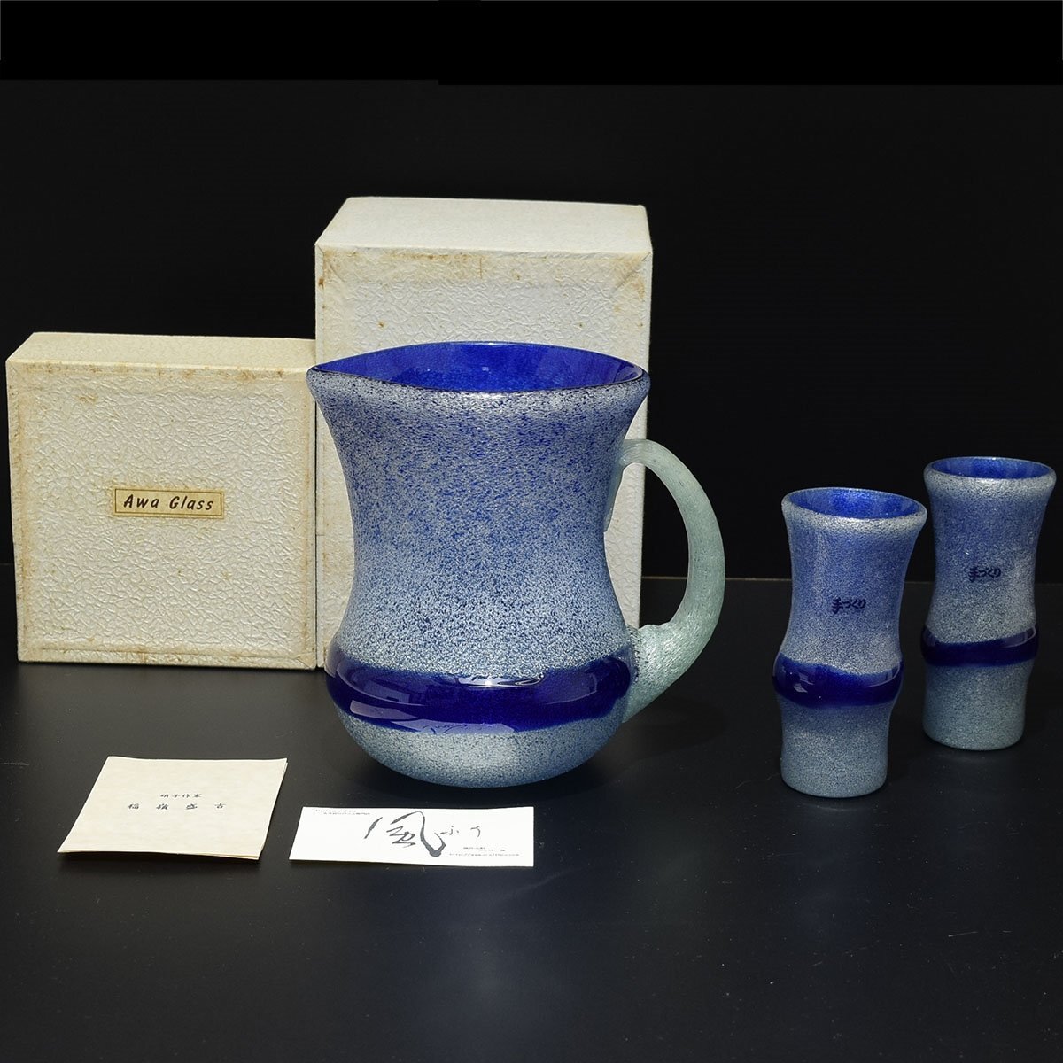 > ◎559338 美品 名工 稲嶺盛吉 琉球ガラス 泡ガラス 水差し タンブラーセット 宙吹ガラス工房 ハンドルピッチャー 工芸ガラス