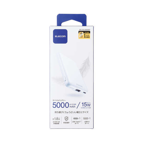 - 薄型コンパクトモバイルバッテリー 5000mAh 最大3Aの出力が可能 USB Type-C×1ポート/USB A×1ポート搭載: DE-C45-5000WH