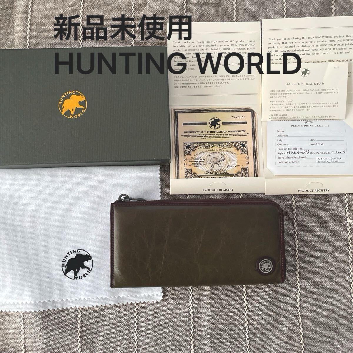 - 新品未使用!HUNTING WORLD 長財布 690BLA-GRBR イタリア製 レザー 財布 カーキ ハンティングワールド 箱入り ロングウォレット