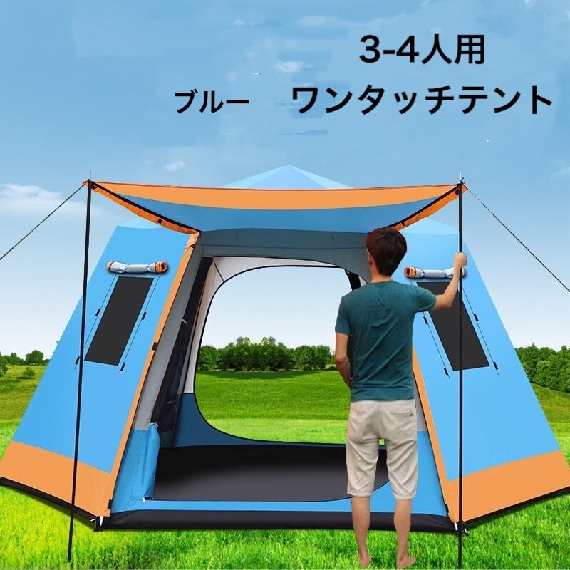 - 3-4人用 ワンタッチテント ひっ張るだけで簡単設置 アウトドア キャンプ ビーチテント UVカット ドーム型 虫よけ 大型 ブルー