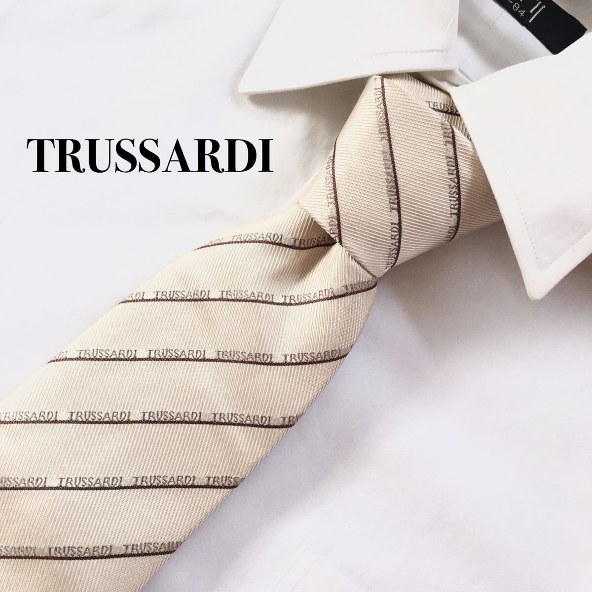 - トラサルディ TRUSSARDI シルク 絹 ネクタイ ベージュ レギュラータイ ビジネス カジュアル フォーマル イタリア製 ストライプ柄