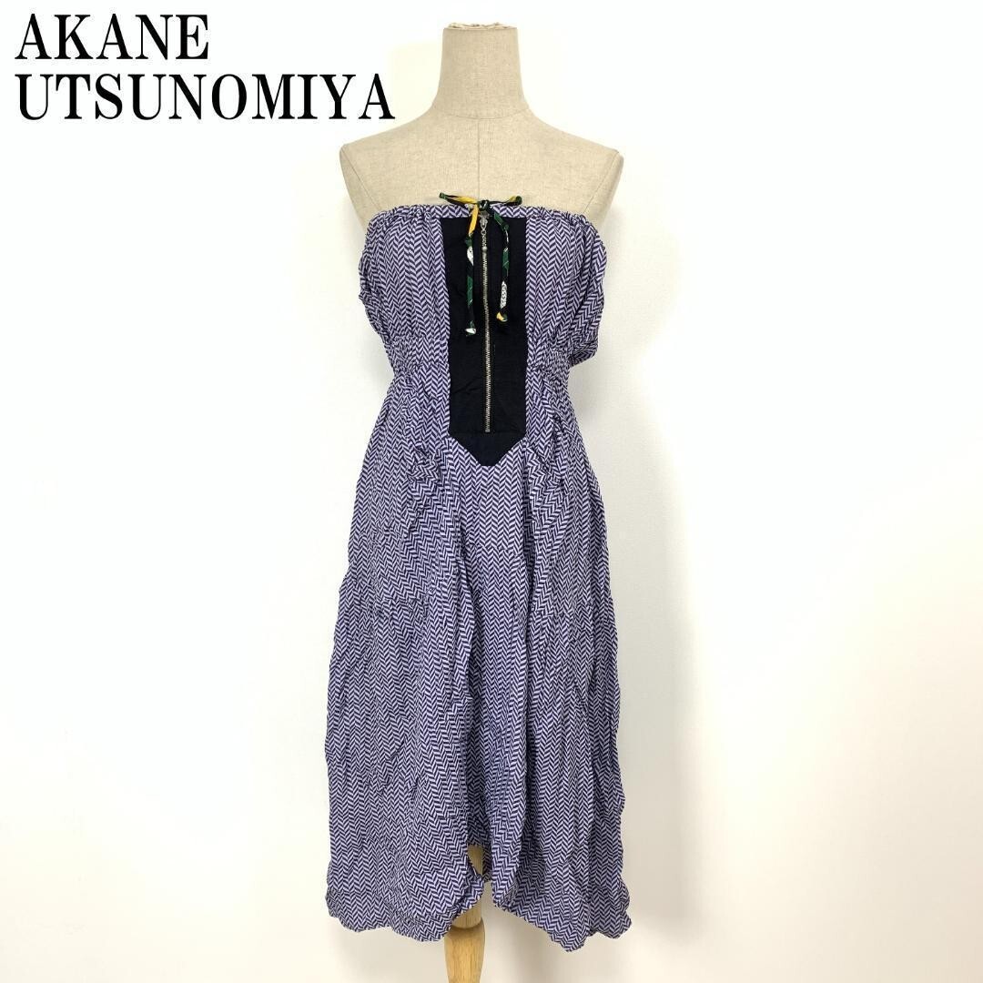 - LA7529 アカネウツノミヤ AKANE UTSUNOMIYA ウエストゴム 総柄 フレアノースリーブワンピース レーヨン ベアトップワンピース ブルー 36