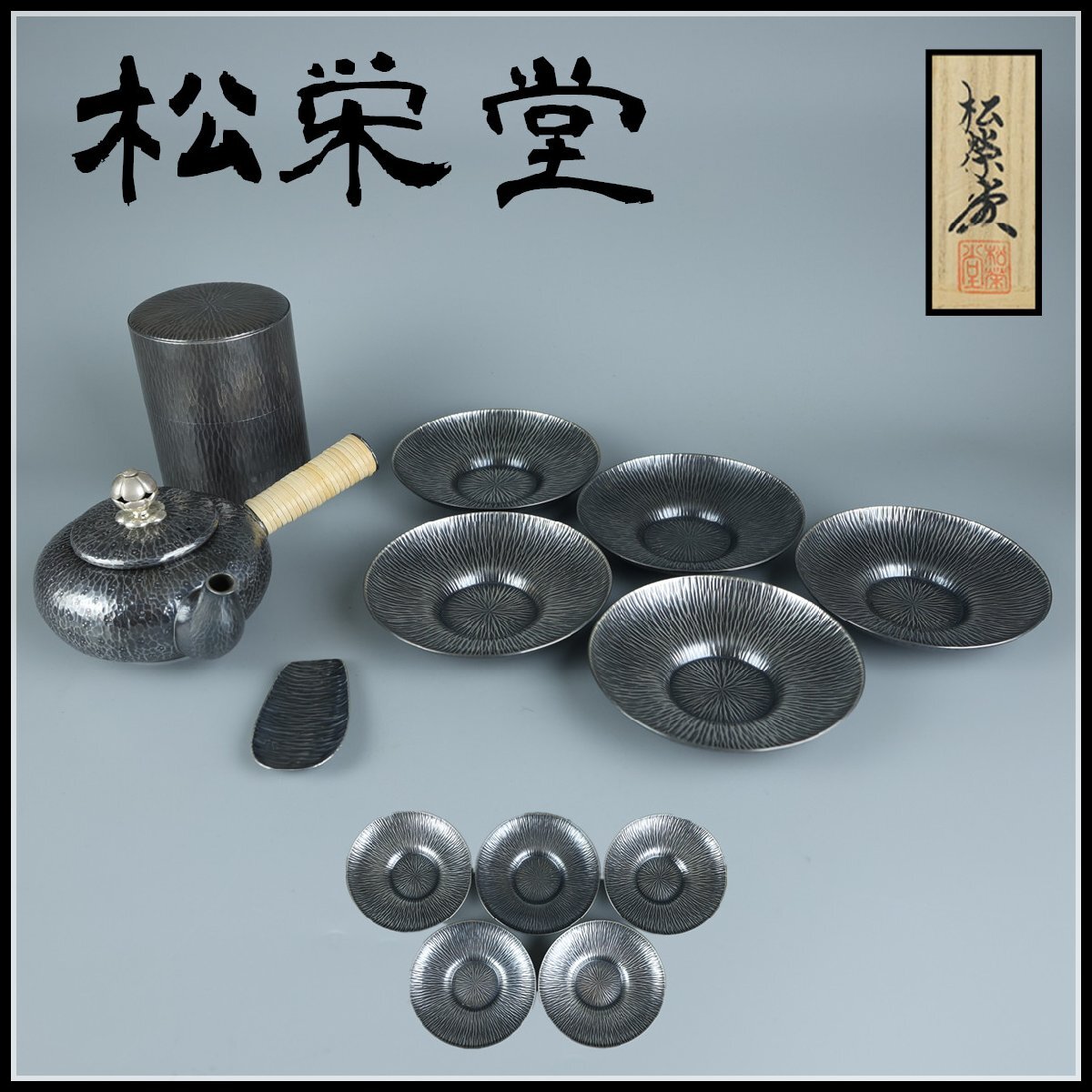 > 【志】K1452 茶器セット 松栄堂造 純銀 茶器揃 横手急須 茶托 五客 茶則 茶入 茶道具 急須 共箱 重量1245g