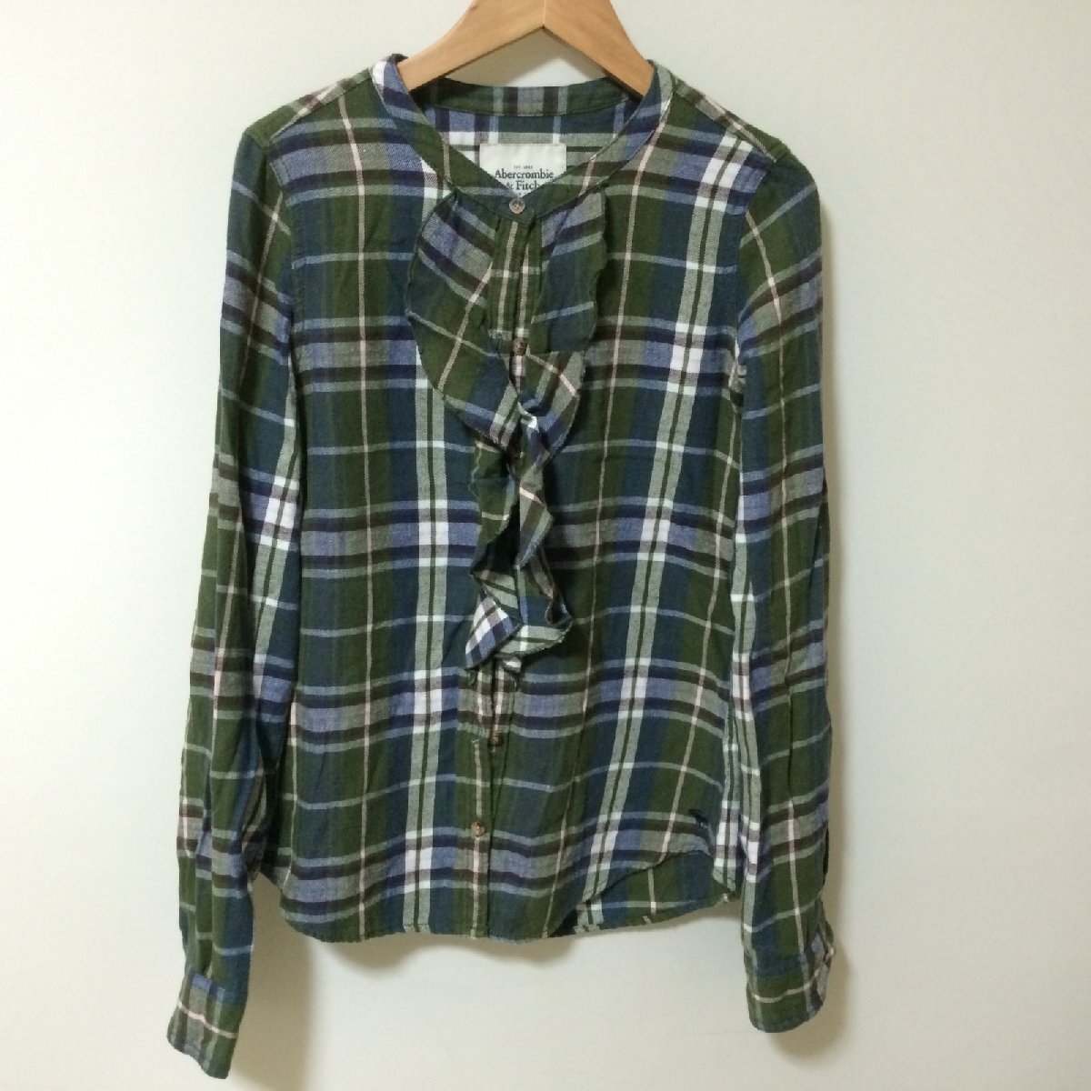 > C111 アバクロンビー&フィッチ チェック柄 ブラウス シャツ フリル グリーン XS 長袖 【メ便】