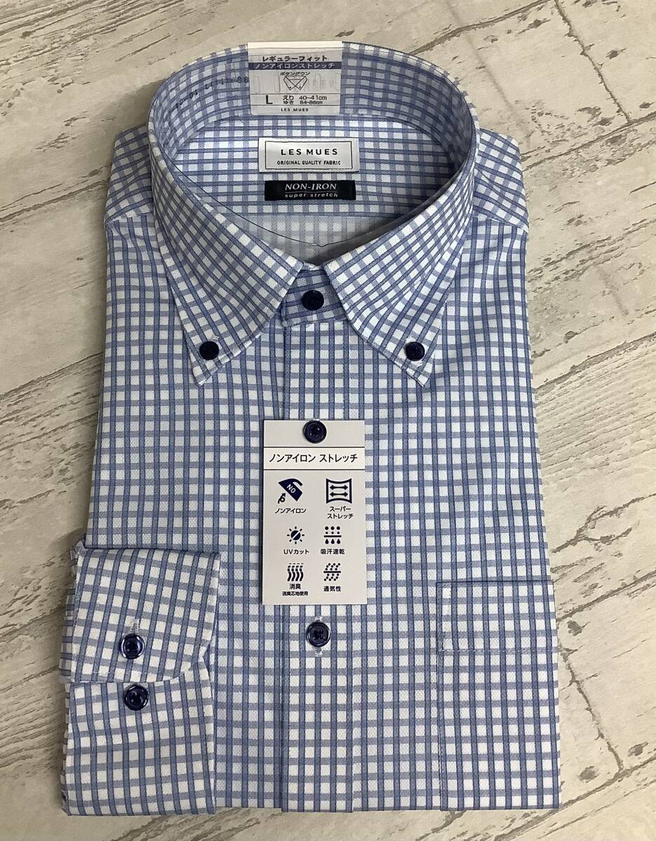 - 新品未使用★カッターシャツ ★41-86長袖Lサイズ ★ 定価4,990円の品 スーパーストレッチ ボタンダウン ブルー系チェック柄