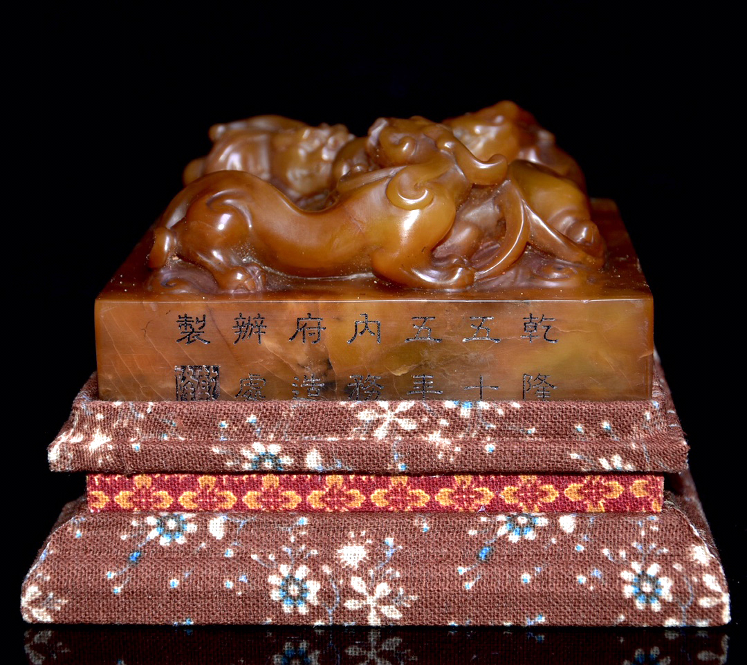 - ▽鴻▽清朝時代 寿山石 田黄石彫 乾隆御覽之寶 三龍戯珠鈕寶璽印章 隆55年内務府造弁処製 箱付 時代物 中国古美術 骨董品