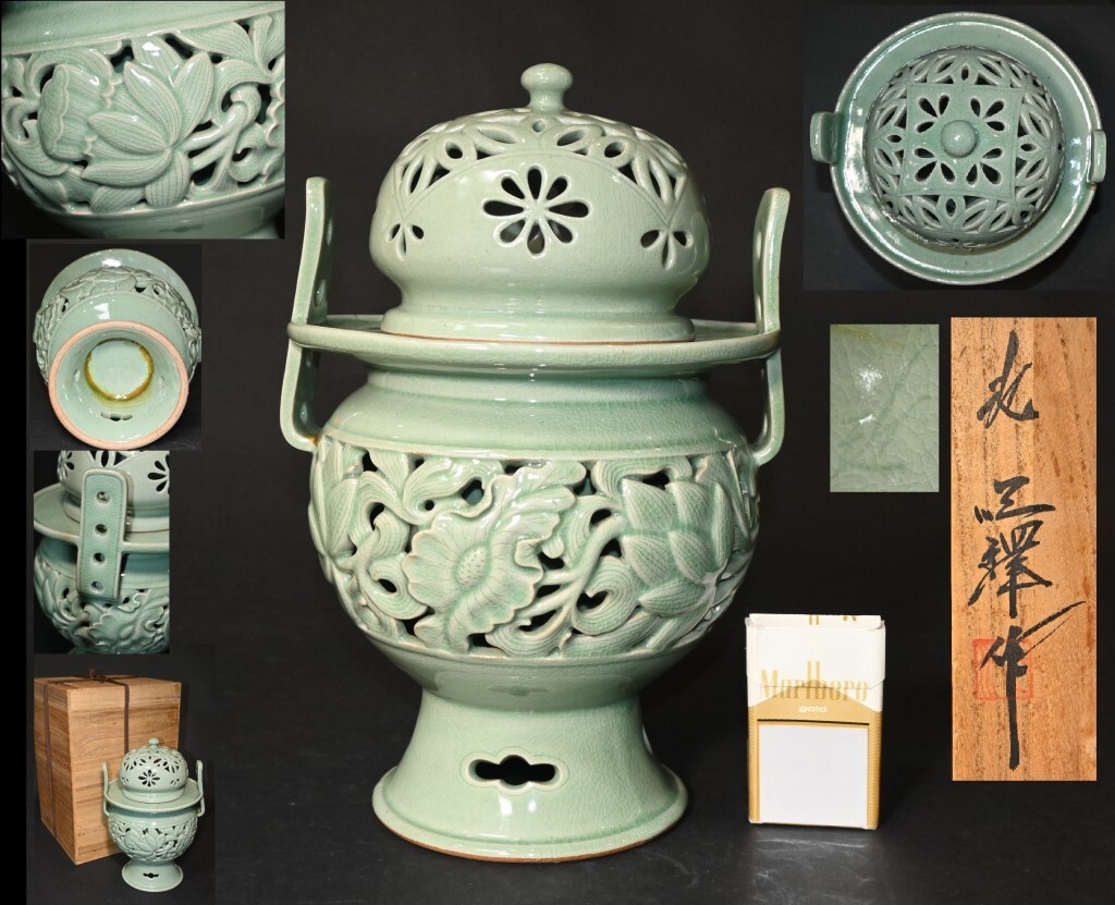 - 韓国人間文化財■池順鐸 作■ 高麗青磁 二重透彫大香炉 高約31.5cm 難有 双耳 透かし花文 共箱 大型 特大 香爐 香道具 茶道具 韓国京城生