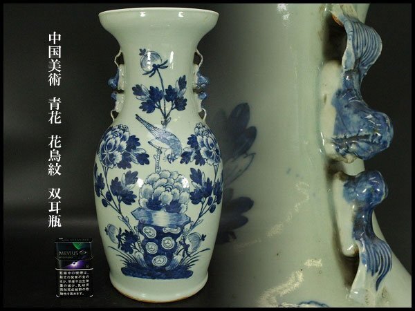 > 【銀閣】中国美術 青花 花鳥紋 双耳瓶 高41.5cm 旧家蔵出 送料無料(XA481)