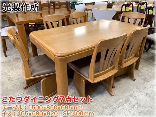 - 光製作所 こたつダイニング7点セット テーブル1500x850x685mm 回転チェア6脚 HIKARI 送料別途【長野発】