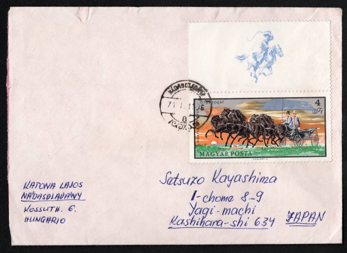 - ハンガリー 1968年 馬の調教(関連タブ付き)1枚貼り実逓カバー【説明参照】