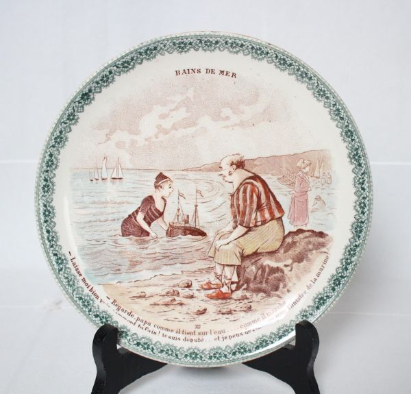 - フランス アンティーク HB&C BAINS DE MER 古い陶器の飾り皿 海辺で遊ぶ親子 美品