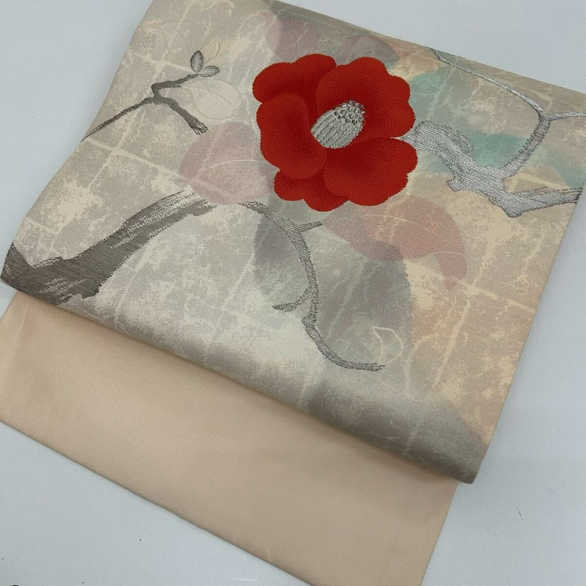 - 名古屋帯 椿の織出し パステルカラー 九寸 正絹 着物 W-4809