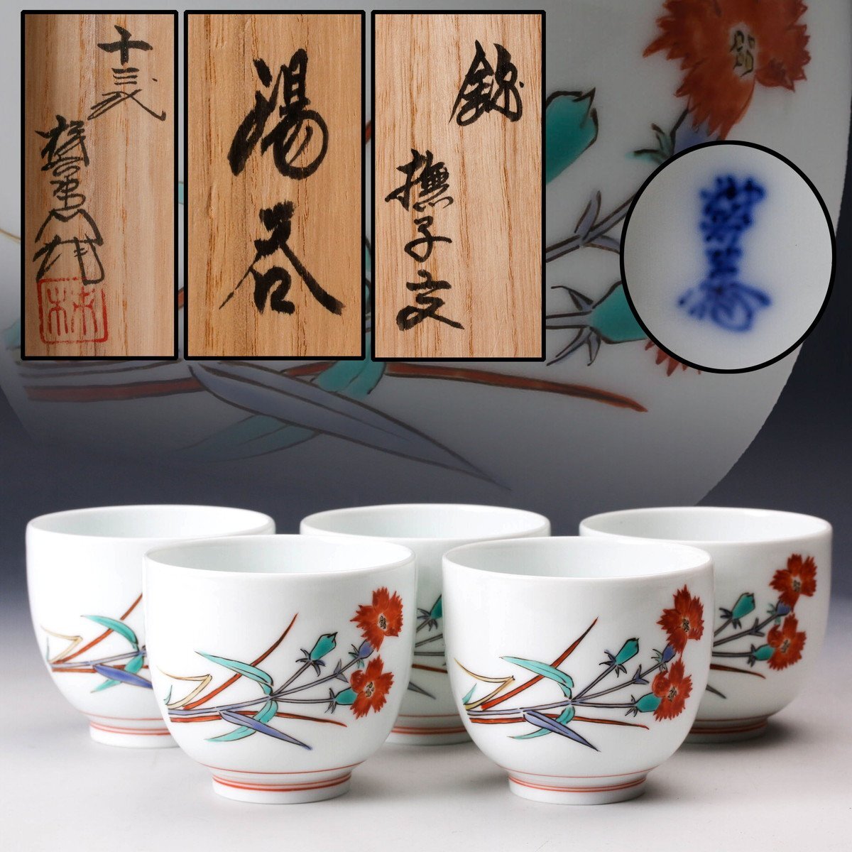 > 【佳香】十三代 酒井田柿右衛門 錦撫子文湯呑 五客 共箱 共布 栞 本物保証