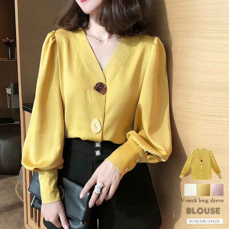 - スキッパー ブラウス レディース Vネックシャツ ランタンスリーブ 長袖 L アイボリー