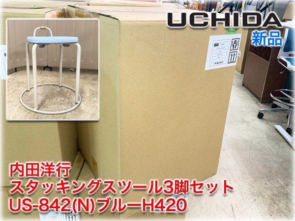 - 【新品】内田洋行 スタッキングスツール3脚セット US-842(N)ブルーH420 カラー角座椅子(取っ手付き) 丸イス ウチダ UCHIDA【長野発】