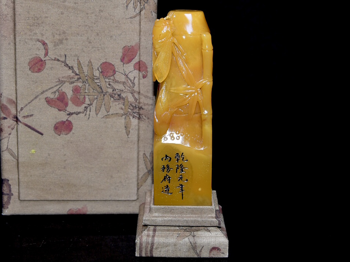 - ▽鴻▽清朝時代 寿山石 田黄石彫 竹蝉鈕印章 乾隆元年内務府造 箱付 時代物 中国古美術 骨董品