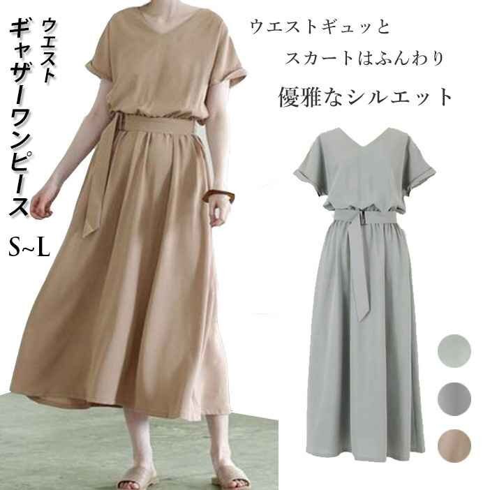 - 春夏 レディース 無地 Vネック ギャザー ワンピース フレアスリーブ 半袖 トレンド 着回し L グレー