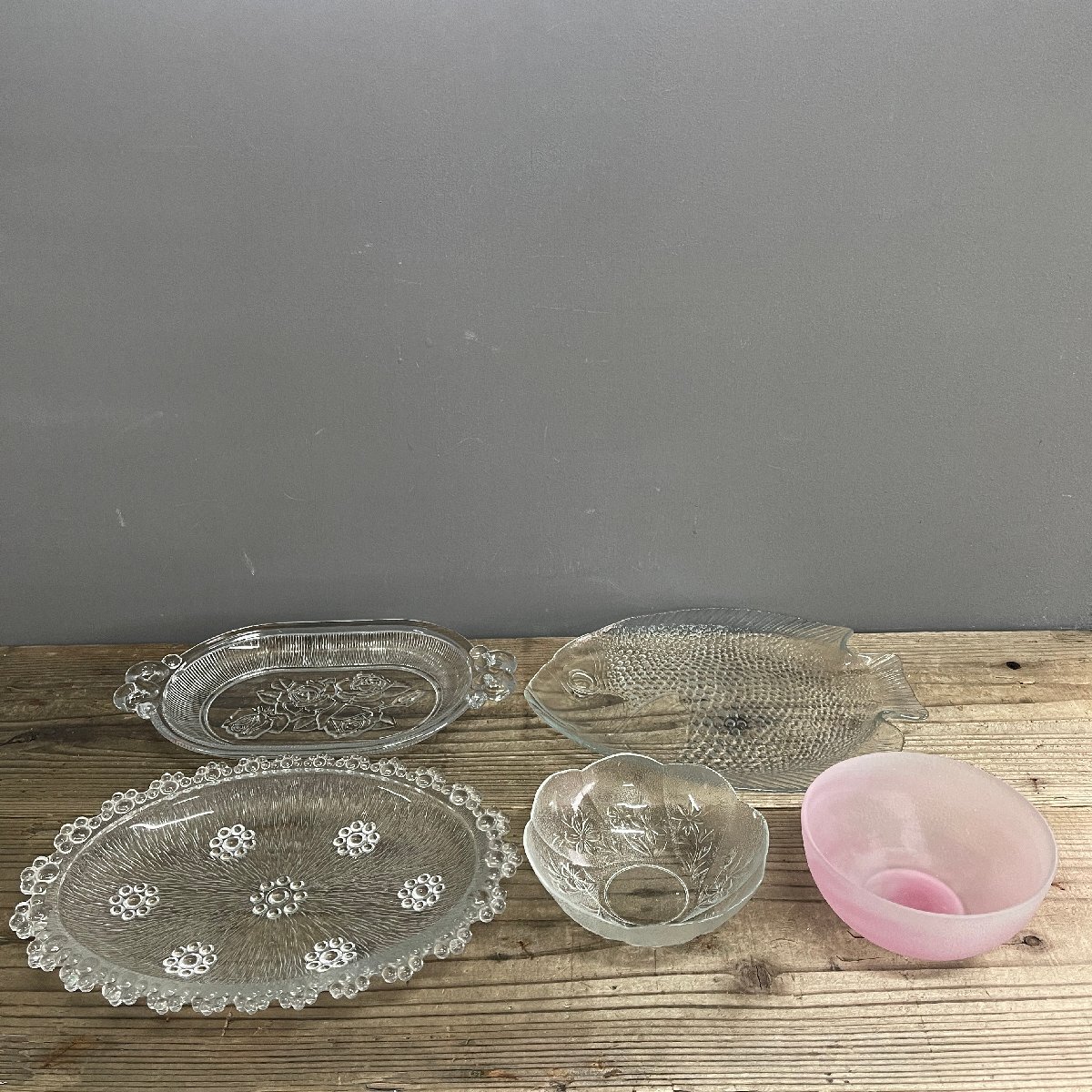 - 中古 昭和レトロ レトロ ガラス製品 お皿 魚 水玉 バラ 花柄 器 深皿 フルーツ皿 5点セット