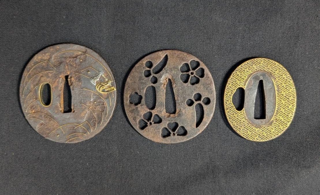 - MIK1902【21】 刀装具◆鍔◆つば◆透かし彫り◆象嵌◆金象嵌◆網代◆布目象嵌◆唐草図◆花◆植物◆柄 【1円スタート】