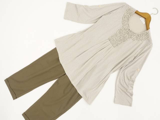 > 美品 la IMAGE等 長袖チュニック+クロップドパンツ コーデ2点セット M相当 グレージュ地 水玉/茶系 カジュアル・ガーリー系 20代・30代