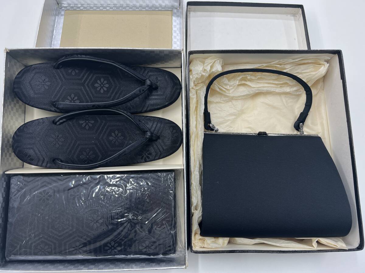 - 和装小物 和装バッグ2点・草履セット 御喪用 喪服 訪問着 礼装 振袖 ブラック 箱付【10817-1】
