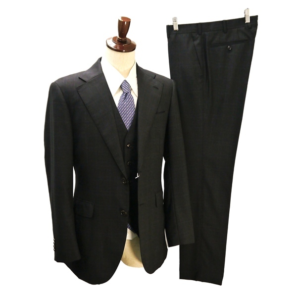 ・春秋冬対応。イタリア製カノニコ使用。ベストあり。2つボタンシングル。総裏地仕上げ。サイドベンツ。フラップポケット。ネーム刺繍あり。本切羽。