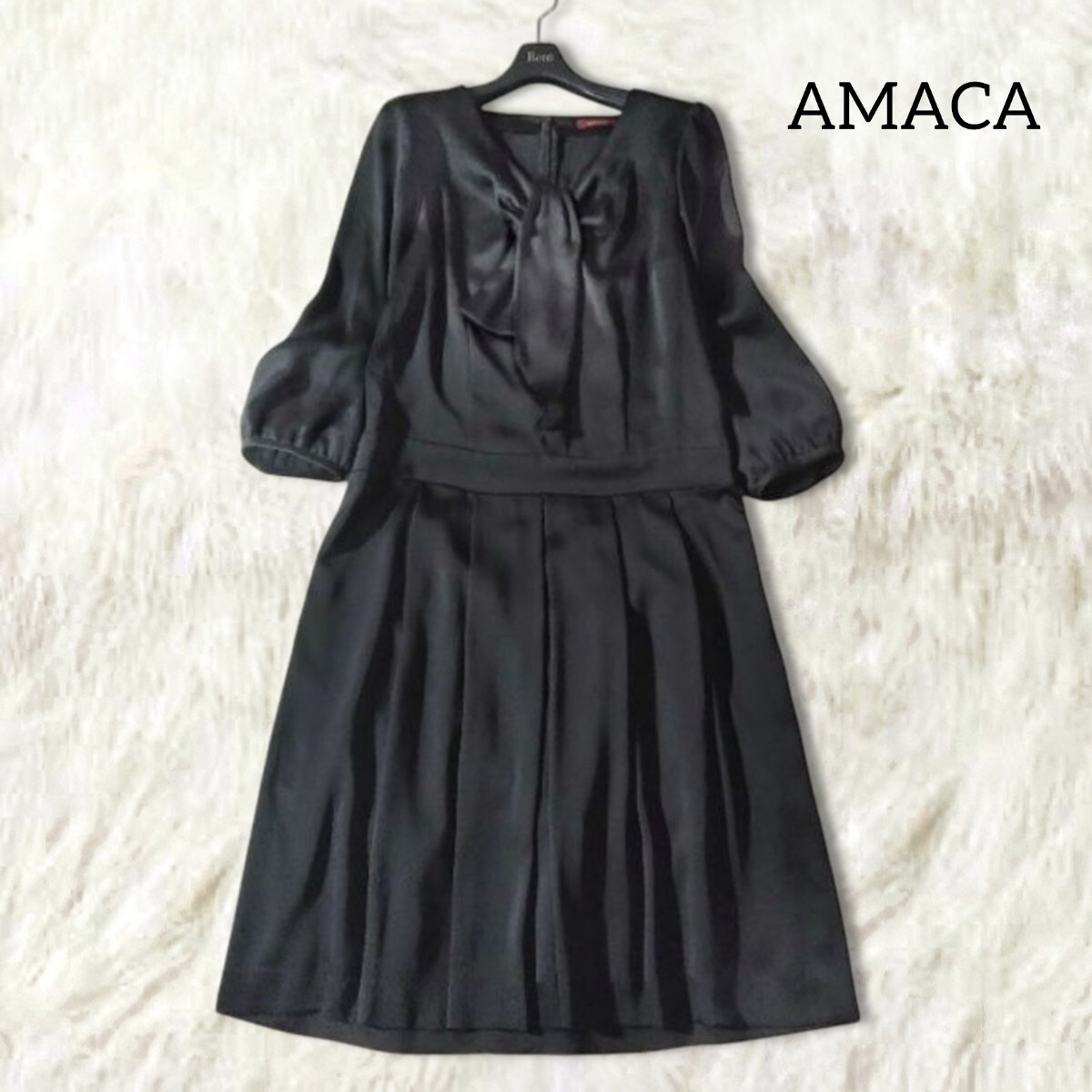> 79 【AMACA】 アマカ ワンピース 40 L三陽商会 ブラック 黒 ボウタイ 上品 ひざ丈 膝丈 フォーマル 薄手 プリーツ ロゴ 光沢感 レディース
