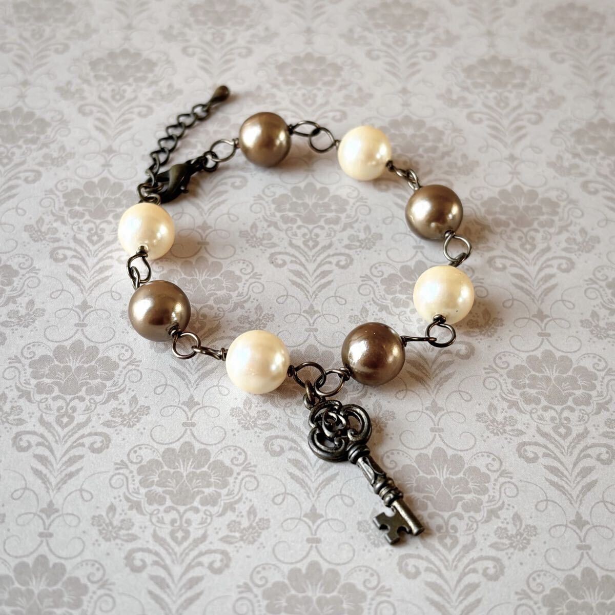 > アンティーク風 鍵モチーフ フェイクパール ブレスレット クラシック レトロ ブラウン 茶 ベージュ ブロンズ 真珠風 ハンドメイド