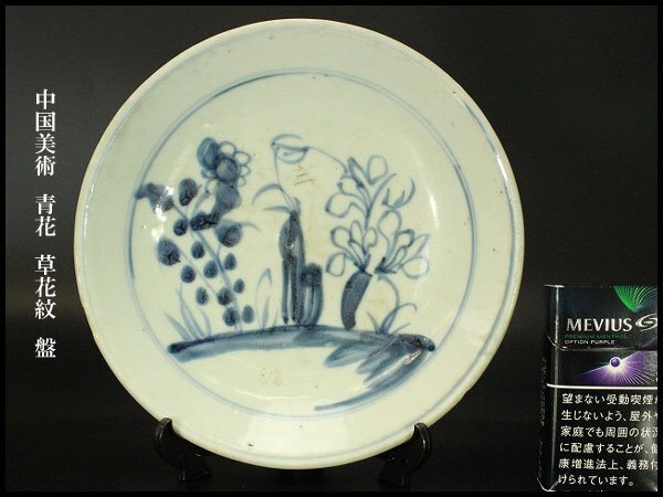 > 【銀閣】中国美術 青花 草花紋 盤 φ19.5cm 旧家蔵出 送料無料(XA412)