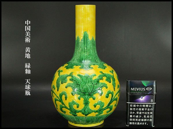 - 【銀閣】中国美術 黄地 緑釉 天球瓶 高23.5cm 旧家蔵出 送料無料(YC223)