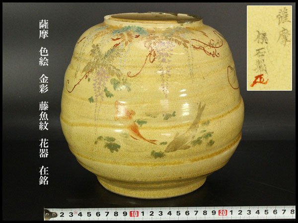 - 【銀閣】薩摩 色絵 金彩 藤魚紋 花器 φ24cm 在銘 旧家蔵出 送料無料(XA363)
