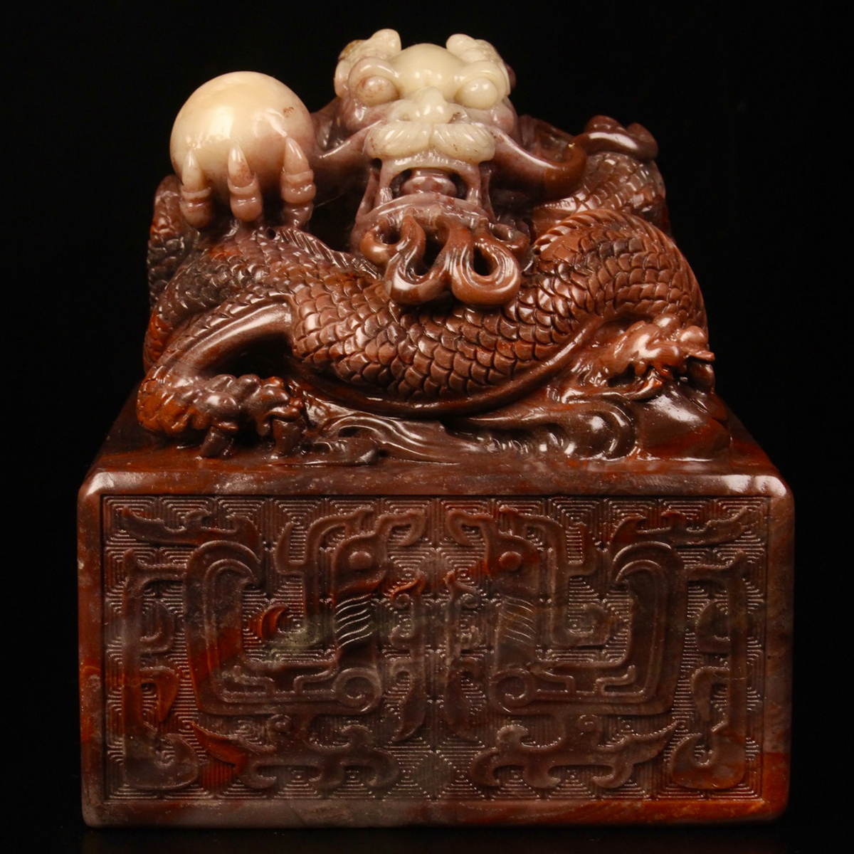 - ▽鴻▽金石篆刻 寿山石 月尾石彫 龍騰盛世素章 印材 箱付 時代物 中国古美術 骨董品