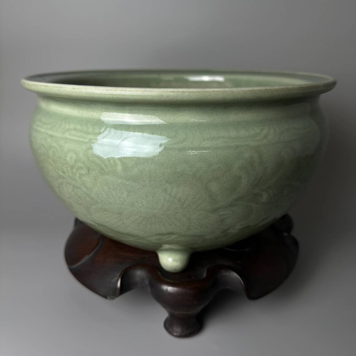- コレクター買取品 中国美術 龍泉窯 青磁 三足香炉 唐物 茶道具 香道具 唐木台座付 中国古玩 飾物 置物 時代物