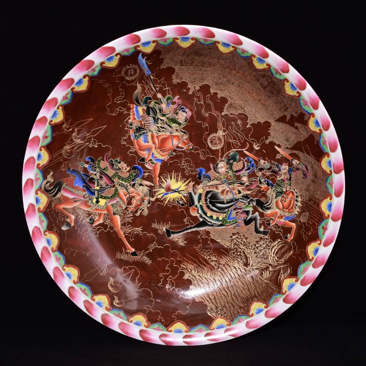 > A_YF0857【惠】人間国宝 中国骨董 陶芸 磁器【清乾隆制琺瑯彩刻金三英戦呂布紋賞盤】工芸品 施釉陶 青花磁 陶芸 置物 收藏品