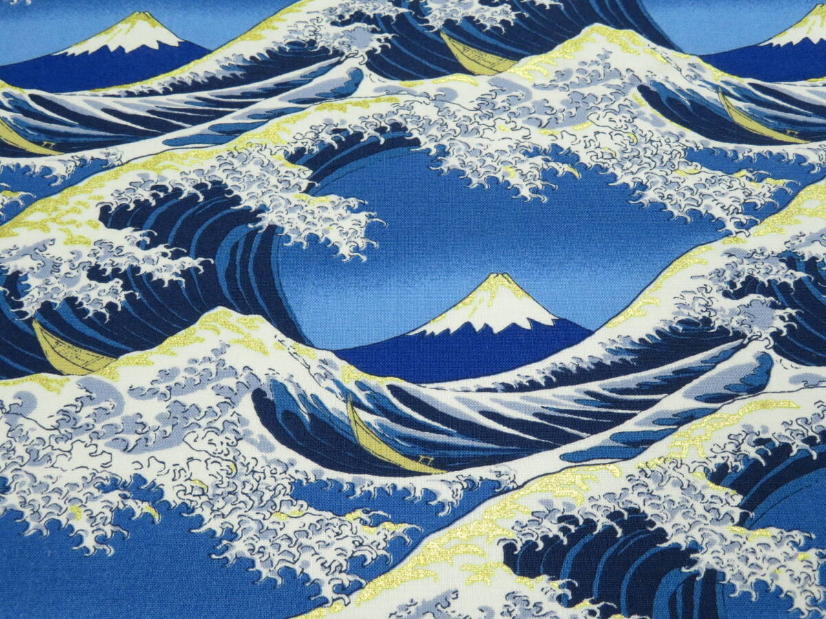 > 1m単位切り売り N-183 富士山 青色 青 海 船 約110㎝幅 和調 和柄 葛飾北斎 富嶽三十六景 浮世絵 世界遺産 薄手 シーチング 布 生地 日本製