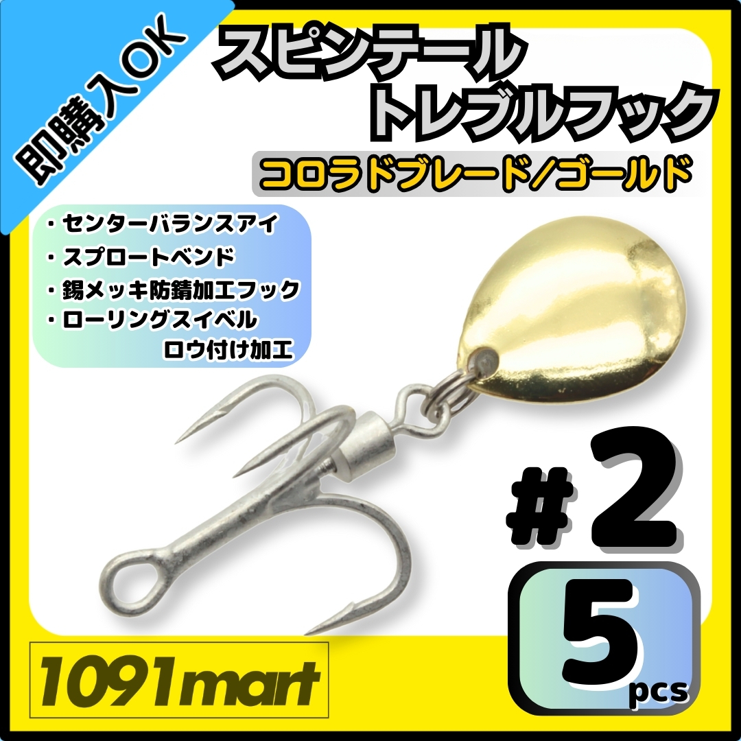 - 【送料無料】スピンテール トレブルフック コロラドブレード ゴールド #2 5個セット ロウ付けスイベル ルアーのブレードチューンに!