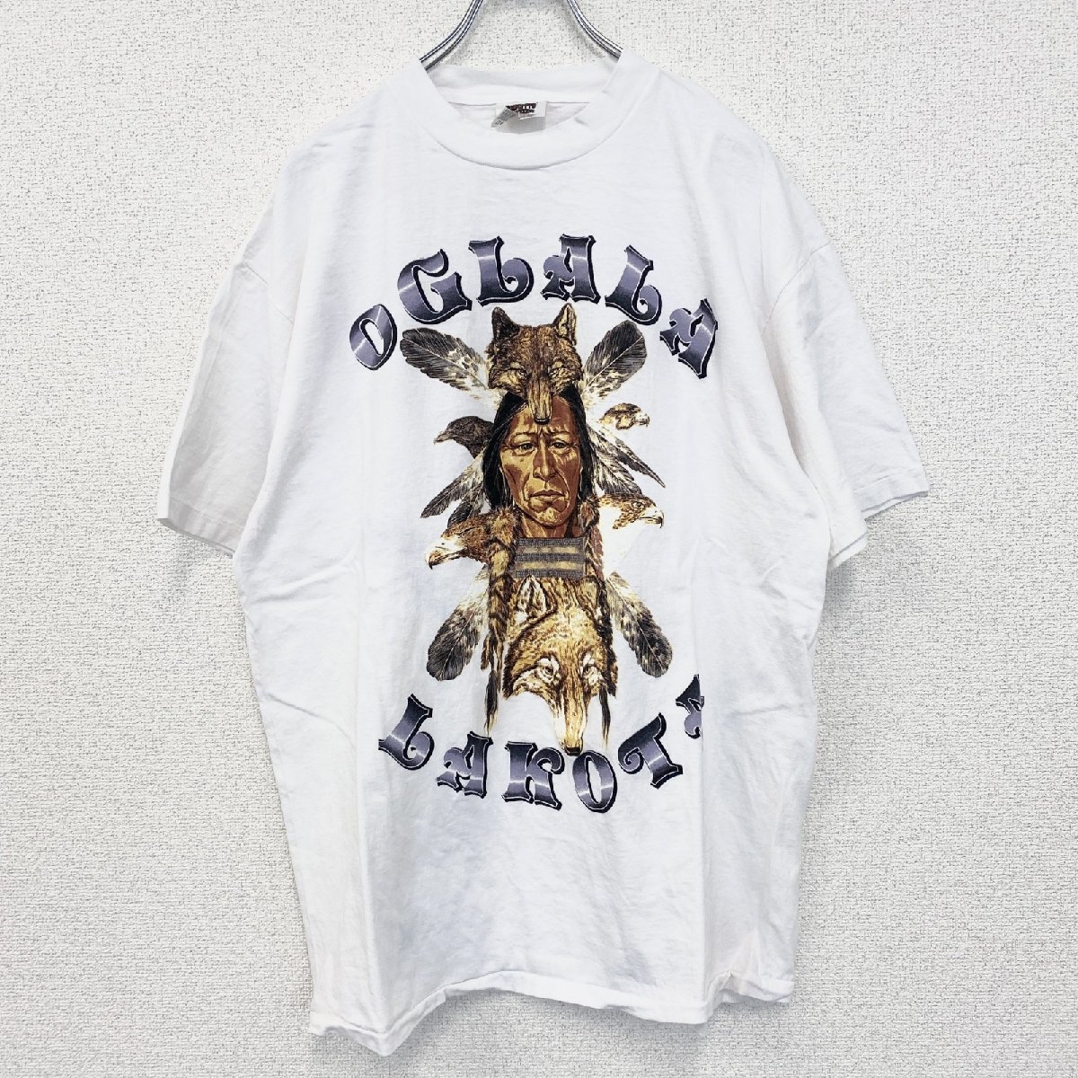 - 古着 used 半袖プリントTシャツ ホワイト 白 インディアン オグラララコタ シングルステッチ XLサイズ
