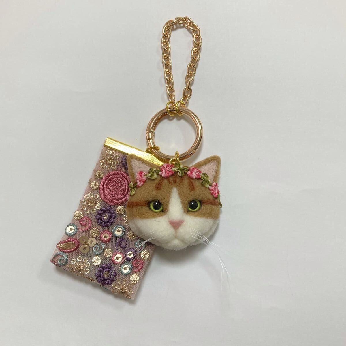 - 羊毛フェルト 猫キーホルダー 猫バッグチャーム 茶トラ白 インド刺繍リボンの飾り