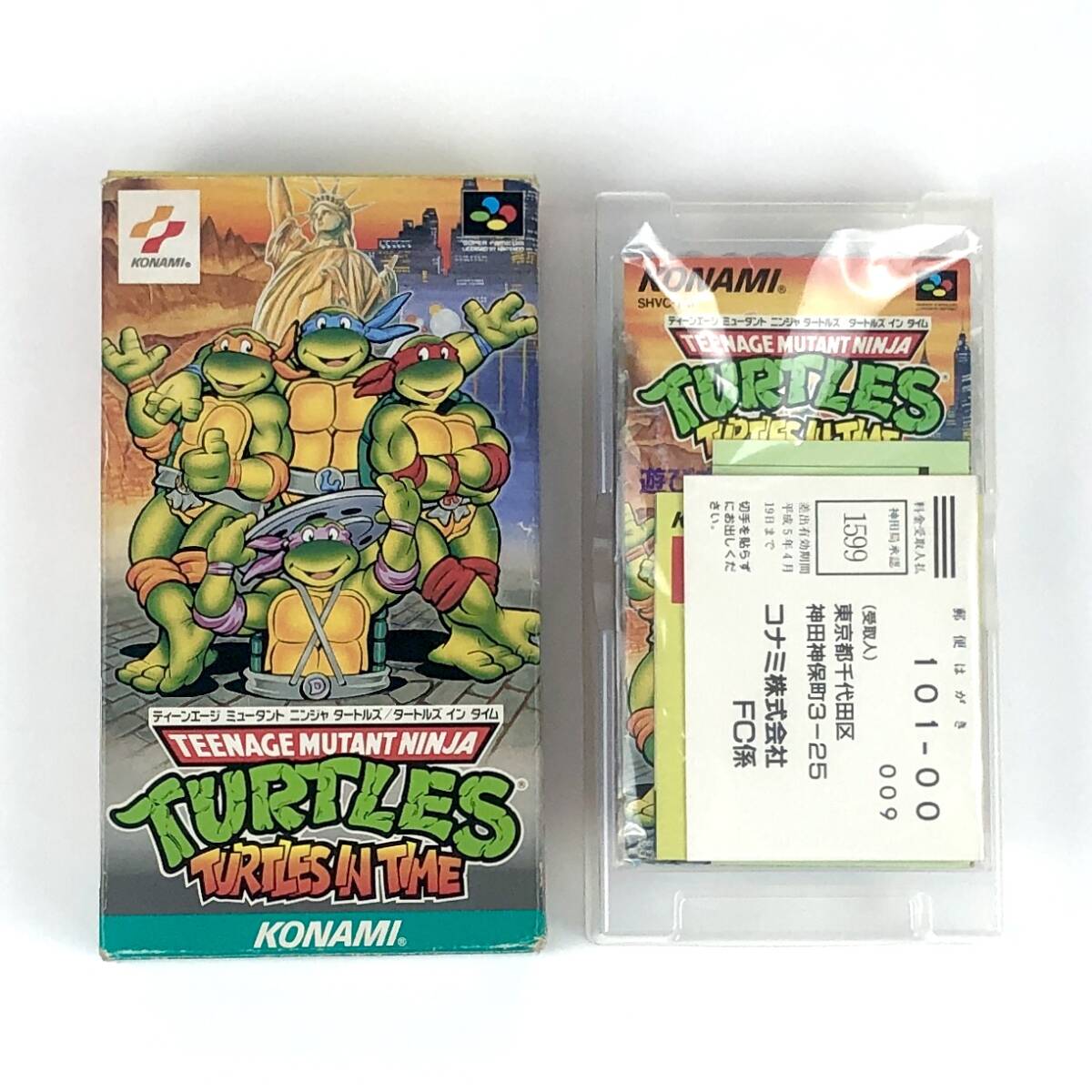 > 【送料無料】 スーパーファミコン T.M.N.T. ニンジャタートルズ タートルズインタイム 箱説・ハガキ・チラシ付き 痛み有 動作確認済 コナミ