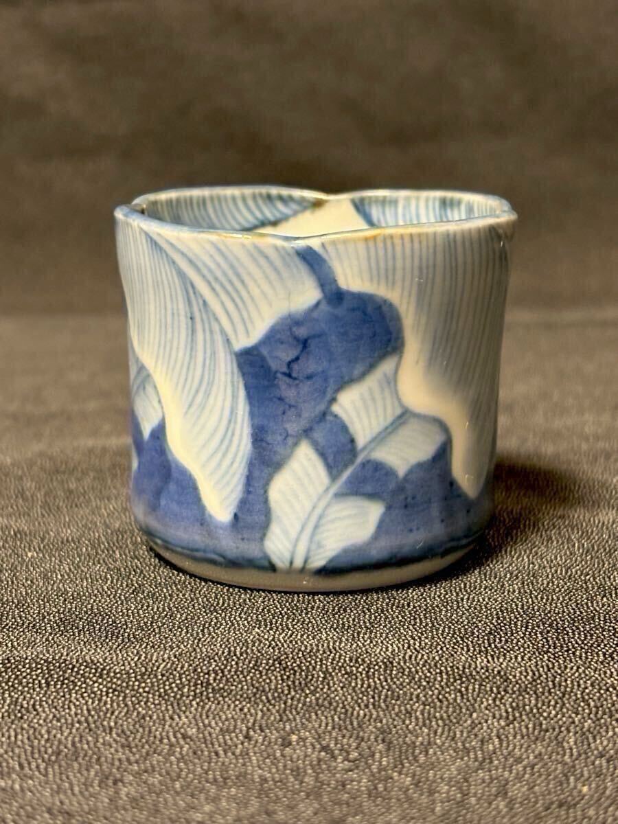 > 和のグッドデザイン!江戸中期 瑠璃釉に薄瑠璃と白抜き モダンな芭蕉紋 緩やかで優美な輪花筒盃 猪口 のぞき うれしい無疵完品です!